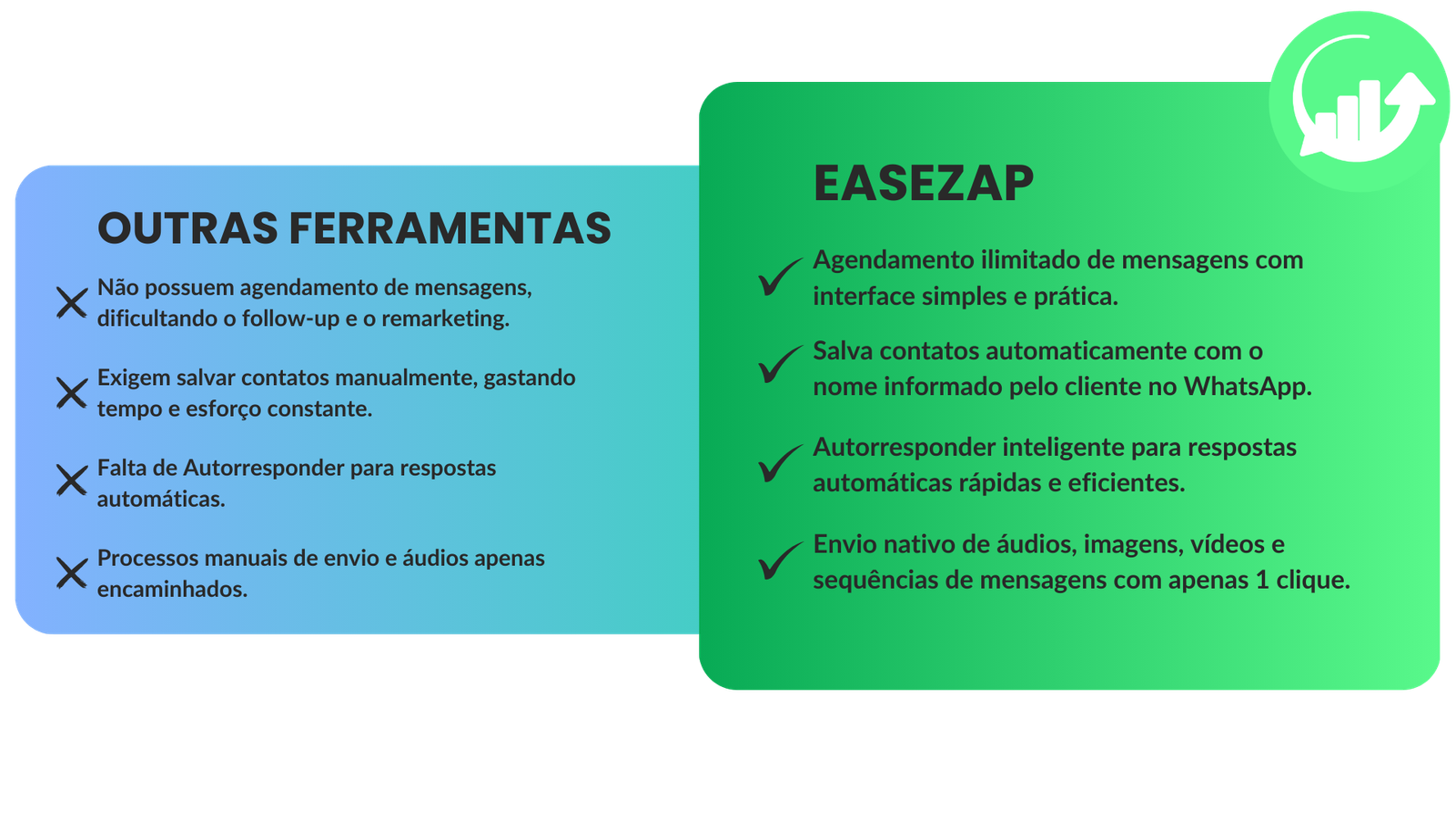 Enquanto outras ferramentas exigem interfaces complexas e processos manuais, o EaseZap oferece automação inteligente. Tudo isso direto no seu WhatsApp, sem complicações!